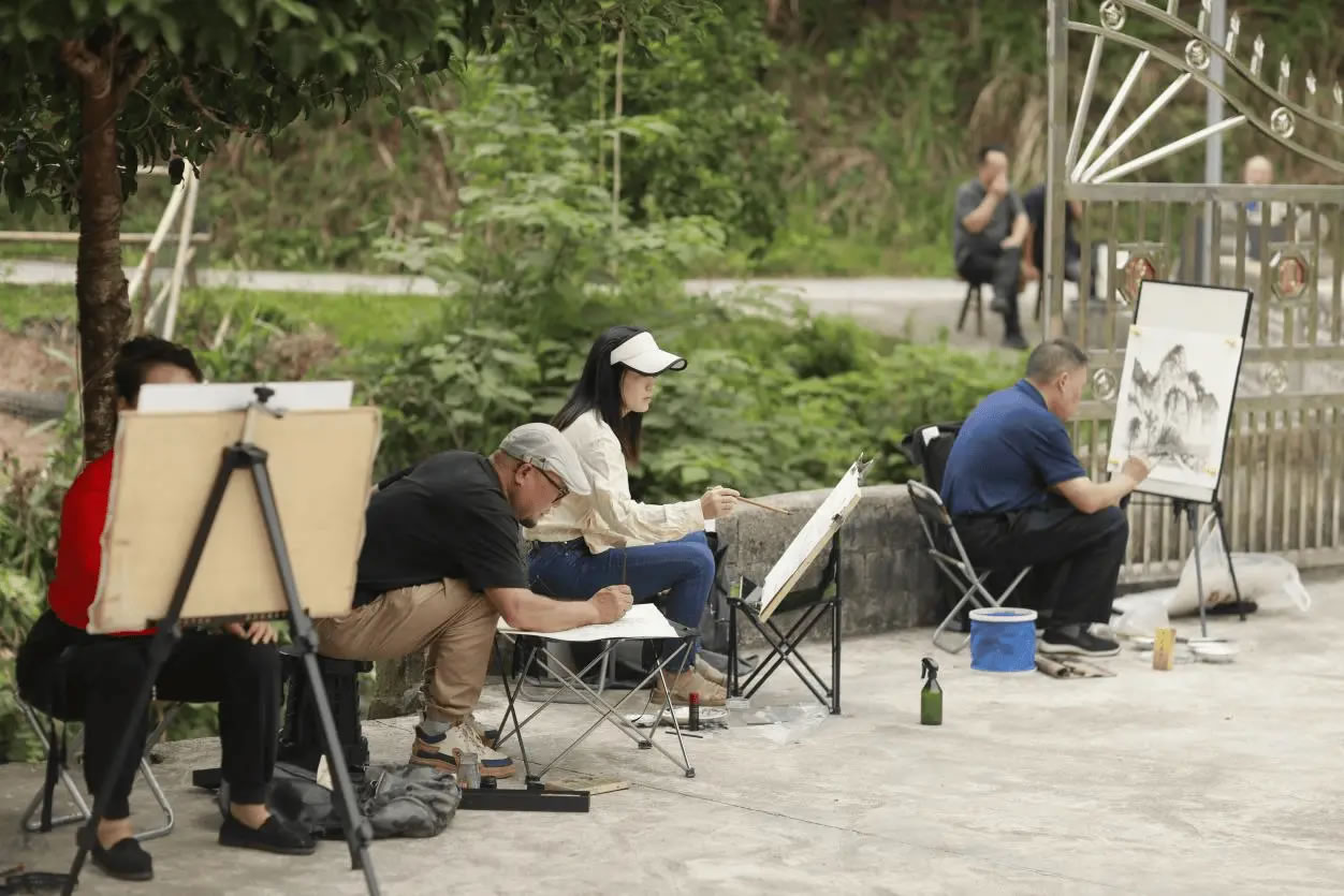 采風(fēng)途中,藝術(shù)交流的氛圍格外濃厚。名家們時(shí)而圍站在一起,探討皴擦點(diǎn)染的技巧;時(shí)而各自凝神,將眼中的崀山轉(zhuǎn)化為筆下生動(dòng)的線條與色塊。一幅幅即興創(chuàng)作的作品,在濃淡墨色的交融間,既展現(xiàn)了丹山碧水的壯闊,又傳遞了鄉(xiāng)村振興的蓬勃生機(jī),讓?shí)~山之美在宣紙絹素上綻放新韻。