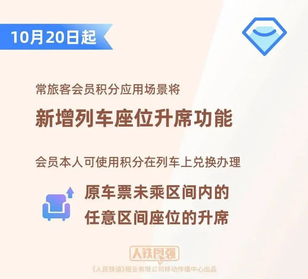 10月20日起,常旅客會員積分應(yīng)用場景將新增列車座位升席功能,會員本人可使用積分在列車上兌換辦理原車票未乘區(qū)間內(nèi)的任意區(qū)間座位的升席。乘車途中,會員可掃描座椅扶手上的“鐵路暢行”二維碼登記升席需求,也可直接聯(lián)系列車工作人員辦理;接到旅客升席需求后,列車工作人員將根據(jù)列車座席空余情況及時進(jìn)行辦理。