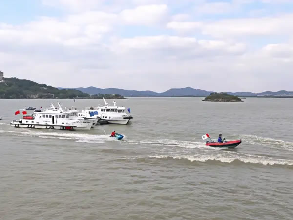 無錫市交通運輸綜合行政執(zhí)法支隊、蘇州市交通運輸綜合行政執(zhí)法支隊、常州市交通運輸綜合行政執(zhí)法支隊、湖州市交通運輸綜合行政執(zhí)法支隊、蘇州市交通運輸應急指揮中心、無錫市公安局水上分局、無錫太湖黿頭渚旅游集團有限公司、無錫市藍天救援隊等兩省四市的交通運輸部門、文旅企業(yè)、社會救援力量參加演練。