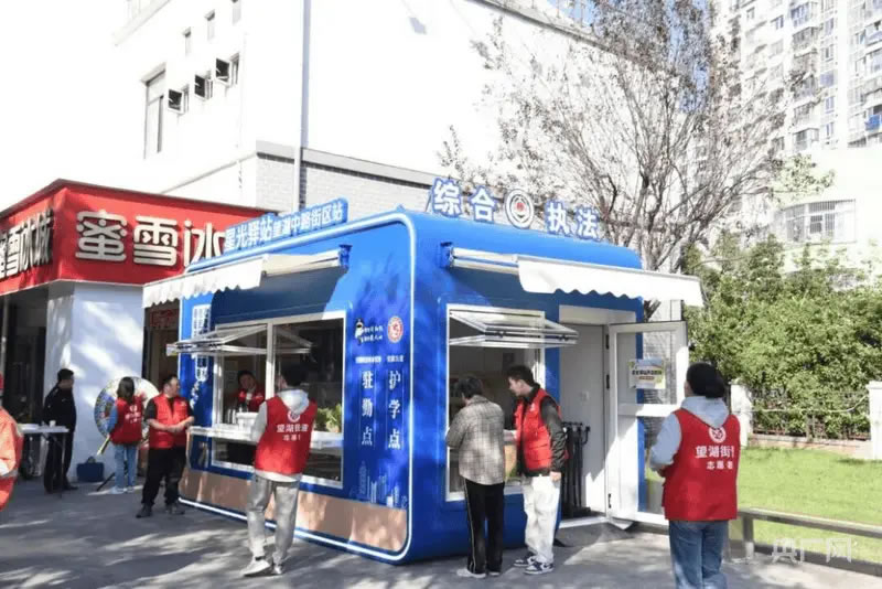 作為街區(qū)重要的“便民樞紐”,星光驛站功能定位清晰明確:面向戶外勞動者,這里是一座“能量補(bǔ)給站”,免費(fèi)提供飲水、熱飯、充電等基礎(chǔ)服務(wù),驅(qū)散奔忙的疲憊;對于周邊居民,它是一處“暖心港灣”,常態(tài)化開展義診、義剪等志愿服務(wù),讓便利直達(dá)身邊;針對沿街商戶,驛站則是一個“助力平臺”,及時(shí)更新政策手冊、提供證照辦理咨詢,助力經(jīng)營發(fā)展。