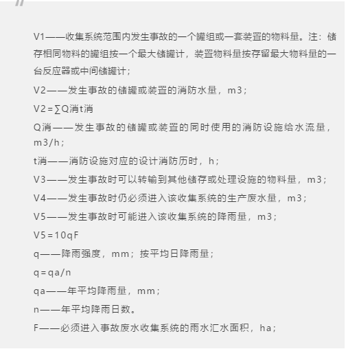 四、《化工建設(shè)項(xiàng)目環(huán)境保護(hù)設(shè)計(jì)規(guī)范》(GB 50483-2019),化工企業(yè)應(yīng)急事故廢水池有效容積計(jì)算公式如下:
