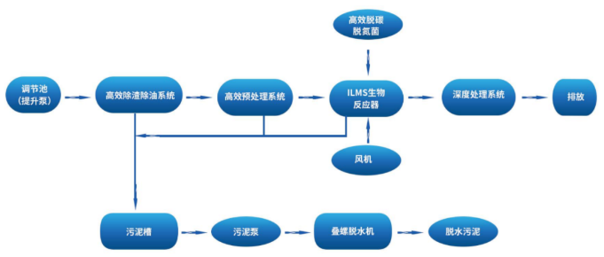 ILMS工藝是以ILMS高效生物反應器為核心處理單元,通過前端高效物化預處理和尾端深度凈化實現(xiàn)垃圾中轉站壓濾液的達標排放,該工藝流程圖如下: