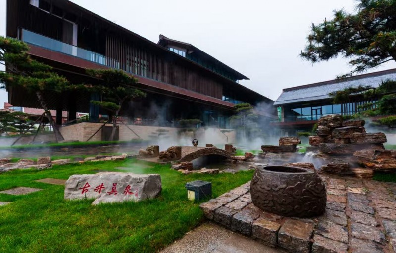 那白,不再是日光下格外耀眼的白,而是閃著被雨水調(diào)和了的,一種溫潤(rùn)如玉的光澤;那瓦,也不再是樸素的灰,而是透著水光,泛著烏亮的顏色,像巨鳥收斂的羽翼,沉靜地棲息著。松風(fēng)館靜默在青松的環(huán)抱里,雨水順著松針的尖端,凝成一顆顆晶瑩的,欲墜未墜的珠子。遠(yuǎn)遠(yuǎn)望去,太行山原本雄渾蒼勁的輪廓,在雨幕里漸漸化作宣紙上暈開的青黛,而繚繞的云霧,恰似畫家筆下有意無(wú)意的留白。此刻,唯有雨水從高處滴落,敲在石上、葉上的聲響,正應(yīng)了那句“青松凝露翠,寒色隱泉聲”的幽靜與禪意。