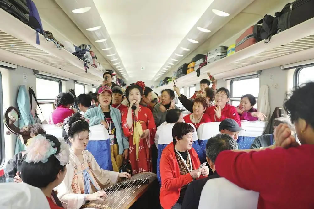 秋日的旅途被一系列精心策劃的活動(dòng)填滿。候車室內(nèi),老年旅客們拉起“環(huán)秦嶺賞秋之旅”的橫幅合影留念,臉上洋溢著笑容;列車上,悠揚(yáng)的古箏與清越的琵琶聲交織,唐風(fēng)歌曲緩緩流淌,瞬間讓車廂充滿雅致氛圍。身著古裝的特型演員帶來(lái)了驚喜互動(dòng),他風(fēng)度翩翩地與旅客們展開詩(shī)詞對(duì)答。旅客們踴躍接句,答對(duì)的人還能獲得定制小禮品,車廂內(nèi)歡聲笑語(yǔ)不斷。